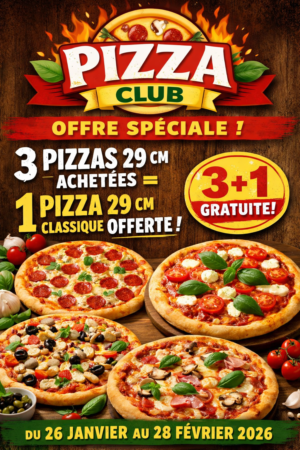 Tous les mercredis et dimanches du 29 septembre au 30 octobre les pizzas 29cm en classiques et spécialités à 10.00€ de 18h30 à 21h30 (offre non cumulable avec d’autre remise).